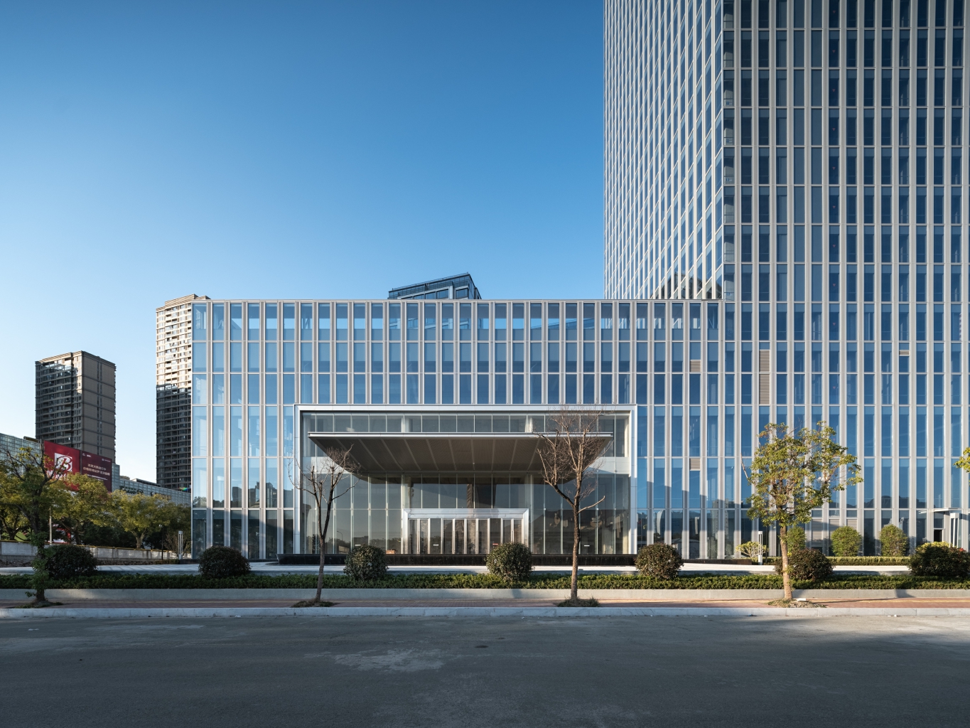 在立面设计上,从方案设计的基础上,随着施工图的不断深化,对建筑立面也不断地深化,酒店裙房部分,针对石材细节,雨棚细节不断的深化,同时在酒店主楼的幕墙上,通过竖明横隐的幕墙构造方式,同时在幕墙设计中,积极参与,通过在幕墙竖向构件中增加竖向刻缝的形式,来增加建筑的精致感。